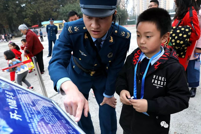 写在前面:在人民空军69岁生日这天,一场“情系国防、筑梦空天”主题军营开放日活动在空军工程大学航空机务士官学校举办。活动现场,该校邀请了驻地党政军领导、企事业单位、大中小学、军人亲属等千余人进行参观体验。此次军营开放日活动旨在深入开展国防宣传教育,进一步密切军政军民关系,广泛汇聚驻地人民群众关注空天、热爱国防、建设空军的正能量。活动现场,通过观看空军宣传片、阅兵仪式、航模表演、军事科目展演、武器装备静态展演、零距离体验军营等方式,向他们展示军人的过硬作风和良好形象,让人民群众零距离感受军营的魅力,在汲取国防教育知识、弘扬尚武精神的同时,加深军民深厚的鱼水之情。走进军营,一部部空军宣传、招飞片令孩子们大呼过瘾;校史馆内,解说员李俏俏、王浏宁认真细致地讲述学校历史和“老八校”顽强拼搏和不懈奋斗的辉煌历史……面对一张张弥足珍贵的资料照片,一件件染尽沧桑的教学用具,学生张宇熙激动地告诉笔者:“参观了校史馆和科研展厅,我要为航空机务士官学校悠久的历史和辉煌的成绩点赞!