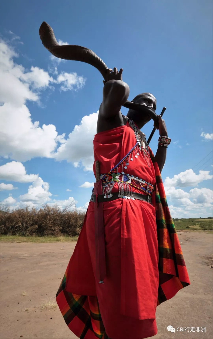 ▲马赛族男子在吹用大羚羊角做成的号角。