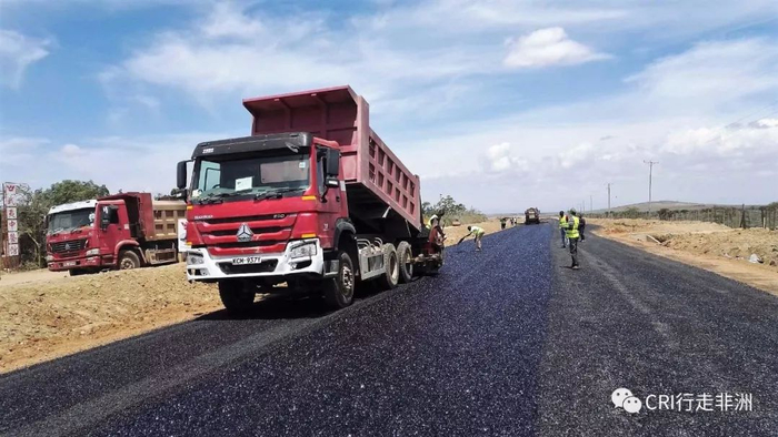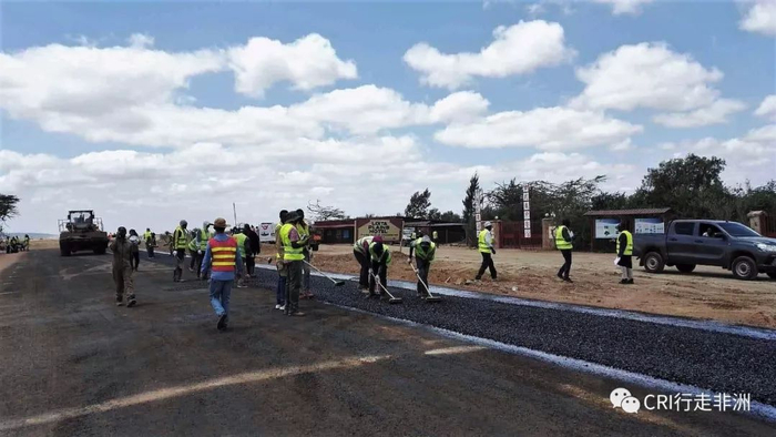 众多工程设备卧伏在施工地点,施工车辆来来往往,中国技术人员和肯尼亚当地工人通力合作,挥汗如雨。