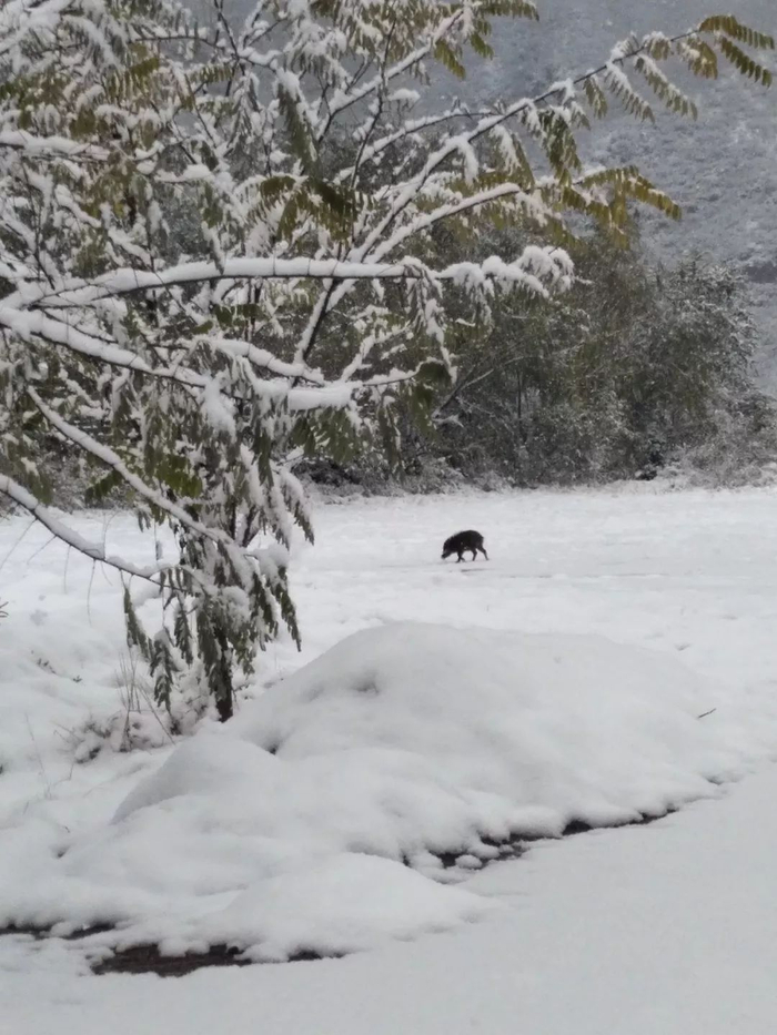 去单位的路上,竟然看到一头野猪从山林里蹿出来,在雪地上低头狂奔,心里很兴奋。我已好多年没见过野猪了。