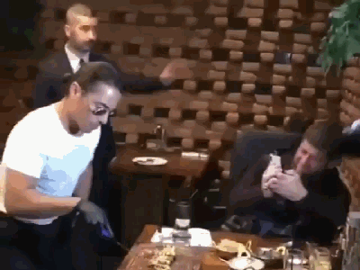 “撒盐哥”用刀尖挑着肉,缓缓地移向卡德罗夫,卡德罗夫仰头用嘴去接肉片,旁边的保镖在观看。