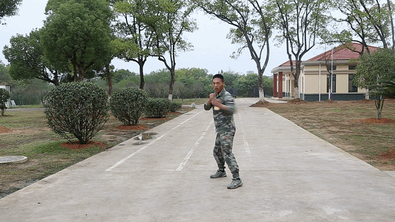 动作要领:前进步时出右直拳,下潜同时击左直拳,右拳护于头部右侧,上步右摆拳击出,右腿向左脚前交叉步,左脚左侧踹,左拳自然摆于体侧,右脚落地后身体左转90°成预备式。
