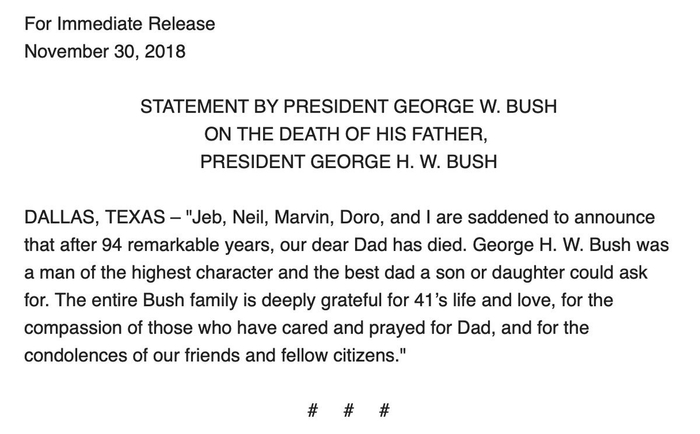 父亲去世后,小布什发布的声明。