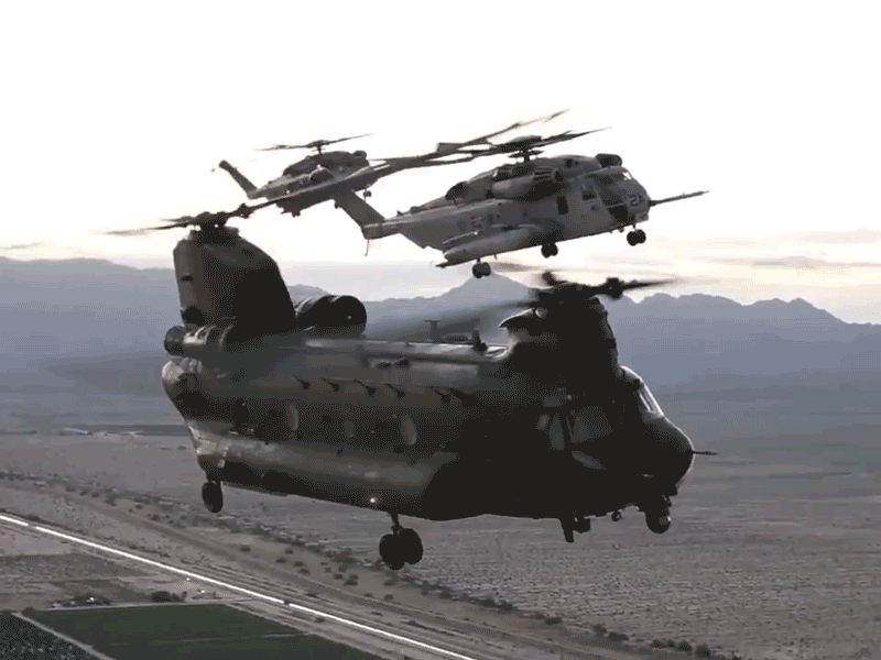英军“支奴干”与美军CH-53E直升机联合编队飞行动态图。