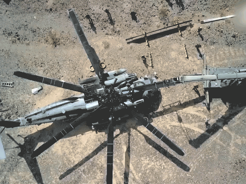 美陆战队进行CH-53E“超级种马”直升机野战更换主旋翼和发动机训练动态图。
