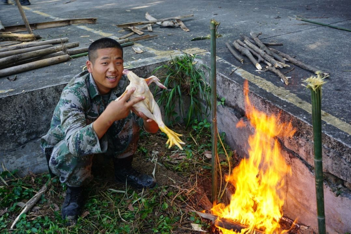 ▲用铁丝、木棍烧烤—美味的烧鸡