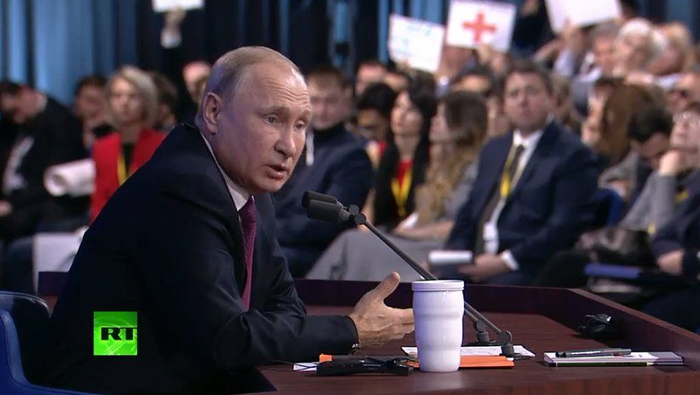 “今日俄罗斯”(RT)20日报道称,在当天的记者会上,英国《金融时报》的记者向普京说,西方视俄罗斯为威胁,并问普京是否想要统治世界。普京则回答称,希望统治世界的人都在华盛顿,而不在莫斯科。莫斯科“想要统治世界”的想法只是一个用来促进西方世界团结的比喻。
