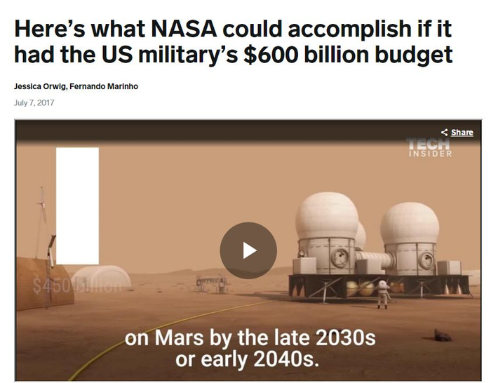 有美国媒体还曾分析说如果NASA能有美国国防部6000多亿美元的经费(2016年的数据),那么在2030年-2040年的时候我们人类都能登上火星了。