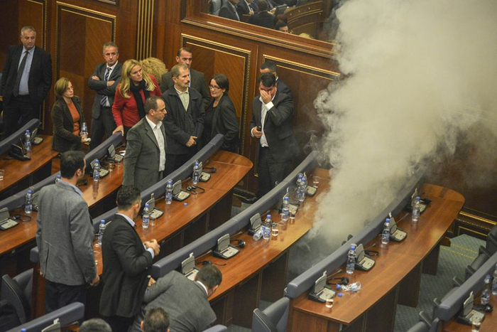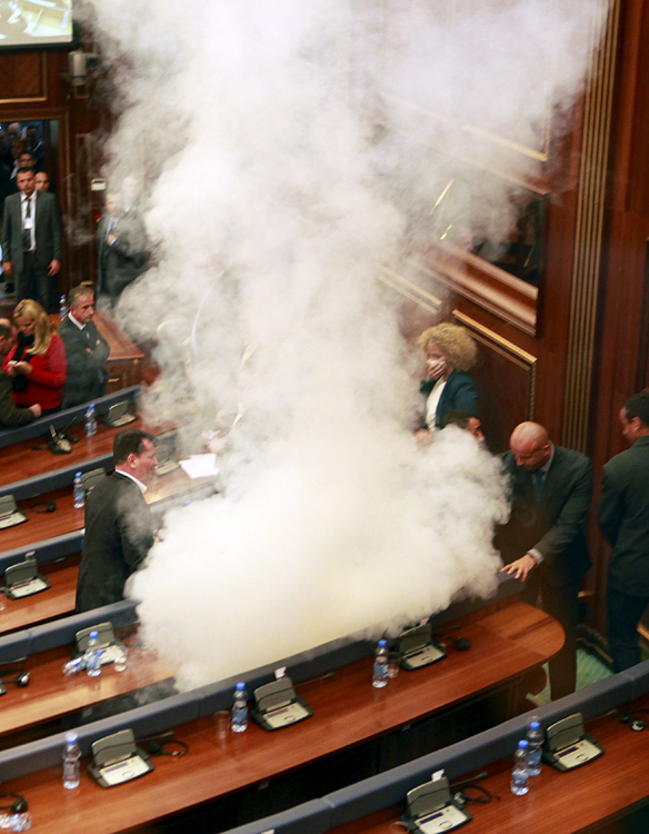 当地时间2015年10月23日,科索沃普里什蒂纳,反对派议员在议会会议上投掷催泪弹,抗议科索沃政府与塞尔维亚达成协议。这是反对派议员一个月内第三次在议会上投掷催泪弹。