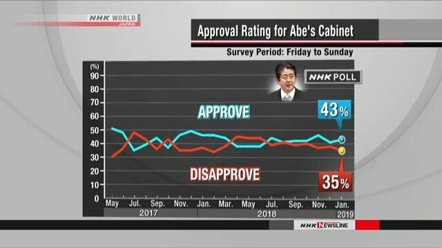 【环球网报道 记者 王欢】日本NHK电视台从1月12日起实施了为期3天的民意调查。其结果显示,与201812月月的调查相比,回答“支持”安倍内阁的受访者为43%,上升了2个百分点,回答“不支持”的受访者为35%,下降了3个百分点。