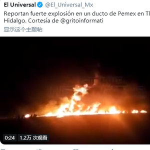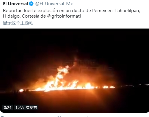 墨西哥中部输油管道爆炸:造成20人死亡、50多人受伤 澎湃新闻 澎湃新闻官方账号 2019.01.1910:48 关注 现场画面(图源:推特)新华社客户端1月19日消息,据外电报道,墨西哥中部一炼油厂附近18日发生管道爆炸,造成20人死亡、50多人受伤。(原标题《墨西哥一炼油厂附近发生管道爆炸 造成20人死亡 50多人受伤》)