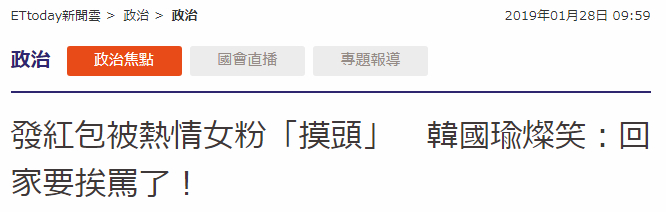 据台湾“东森新闻网”1月28日报道,韩国瑜上任后行程马不停蹄,27日到燕巢角宿天后宫走春发出千个红包,有热情民众提早数小时守在现场排队。其中有一位热情女粉丝领完红包还“偷袭”了韩国瑜头部,让他吓了一跳。