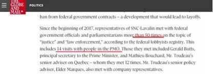 加拿大《环球邮报》给出的一组数据就显示,自2017年,“SNC-兰万灵”公司的说客竟与加拿大联邦政府的官员以及相关国会议员举行了超过50次的会面去探讨“法律事务”,其中有14次会面见的都是总理办公室的高层人员,比如特鲁多的秘书和资深顾问。