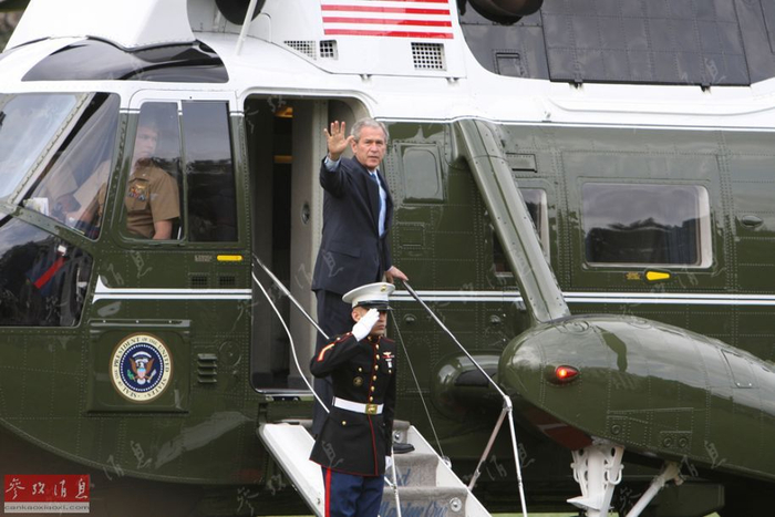 图为美国前总统布什准备乘“海军陆战队一号”起飞。