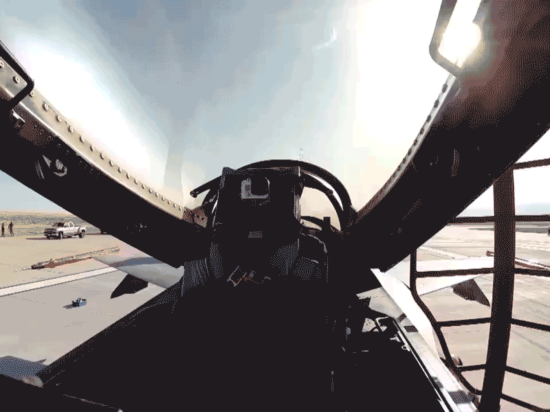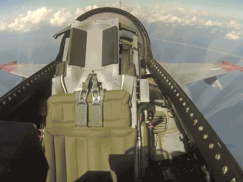 QF-16无人靶机试飞座舱视频截图,只有空荡荡的座舱,并没有飞行员在驾驶,后方则能看到一架有人驾驶的F-16在进行伴飞观察。