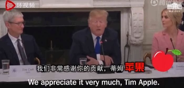 特朗普在会上称赞苹果CEO蒂姆·库克(Tim Cook)时,错将蒂姆·库克叫成“蒂姆·苹果”。库克不但没有纠正,昨日(7日)索性愉快地接受了。