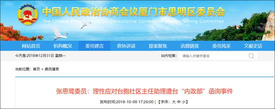 事实上,去年,在厦门海沧区担任社区主任助理的台胞就已被台当局“内政部”发函询问。他们在台湾的家人陆续收到“内政部”的“一般公务机密”函询,要求详细填写一份台籍人员担任大陆社区主任助理意见调查表, 说明工作情况,以认定有无“违法”。