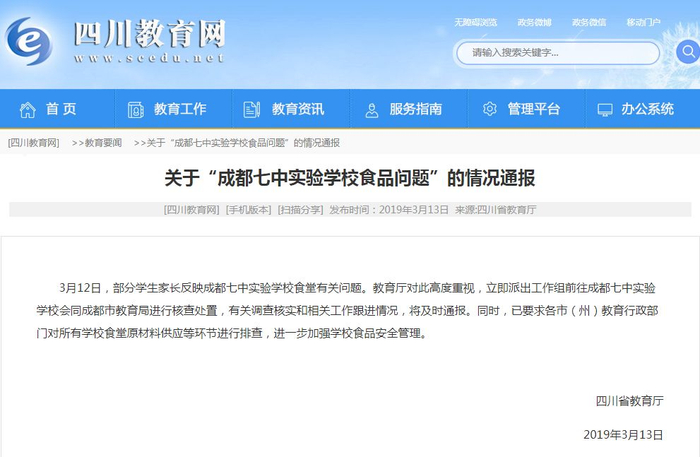 当日,四川省教育厅也发布关于“成都七中实验学校食品问题”的情况通报,称立即派出工作组前往成都七中实验学校会同成都市教育局进行核查处置。