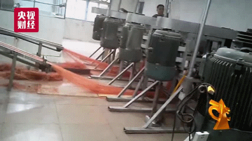 在平江县的另一个厂房里,记者看到一名工人顺手抓起落在地上的面筋丝,放到了机器里,整个过程中,面筋不断在地上拖动……