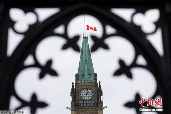 当地时间3月15日下午,新西兰新西兰南岛克赖斯特彻奇市发生清真寺枪击案,造成49人死亡、40余人入院接受治疗。世界多国地标降半旗致哀,悼念新西兰清真寺袭击事件的受害者。图为3月15日,加拿大安大略省渥太华国会山和平塔降半旗致哀。