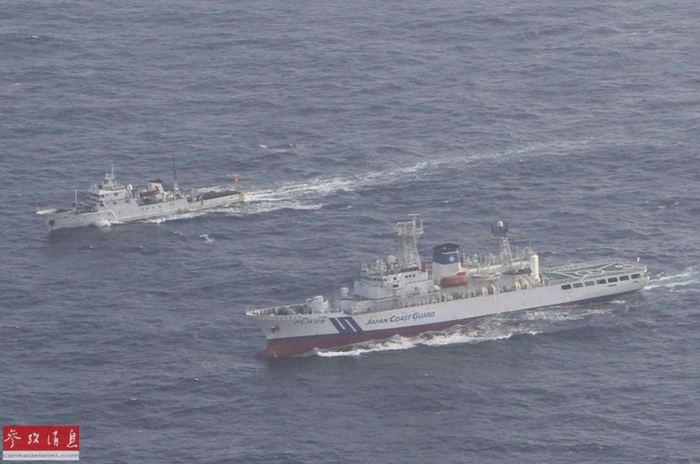 日本海上保安厅发言人说,这是日本首次发现一艘带有这样装置的中国海警船。图为2012年,中国执法船(左)在钓鱼岛海域巡航,遭日本海上保安厅巡逻船(右)阻扰。当时日船的吨位和舰载设备都有很大优势。