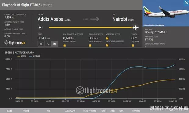 图为ET302事发时曲线。需要注意的是FR24数据未计算机场海拔高度,而亚的斯亚贝巴机场海拔为7657英尺 图源见水印