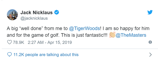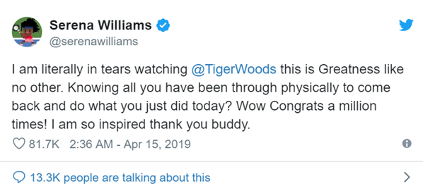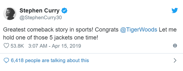 对于伍兹的“王者归来”,除了特朗普,许多名人也在社交媒体上向他表示了祝贺。