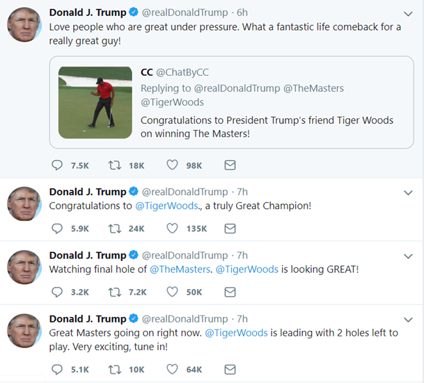 【环球网报道 记者 张飞扬】14日,美国总统特朗普连发四条推特,恭喜刚刚在美国大师赛上夺冠的高尔夫传奇“老虎”伍兹。