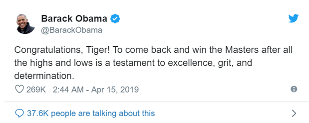美国前总统奥巴马也加入进来,他在推特上写到:“祝贺你,老虎!在经历了所有的起起伏伏之后,重返赛场并赢得大师赛,这是对卓越、勇气和决心的见证。”