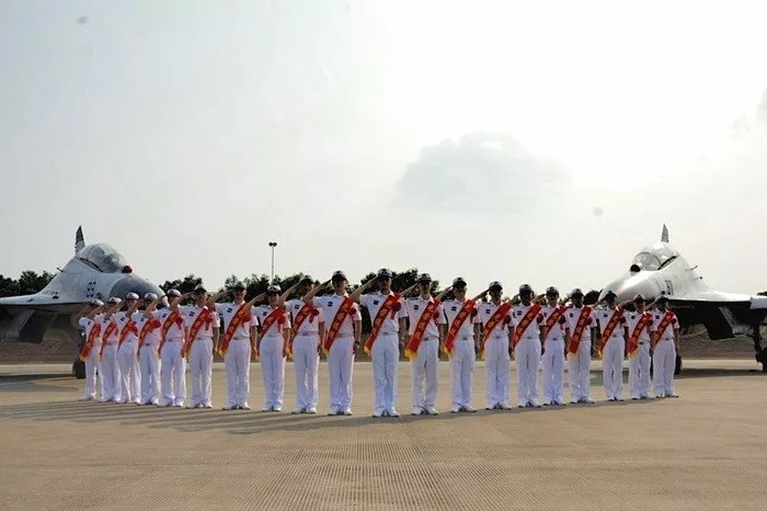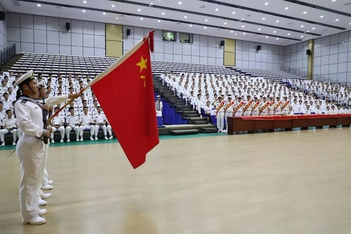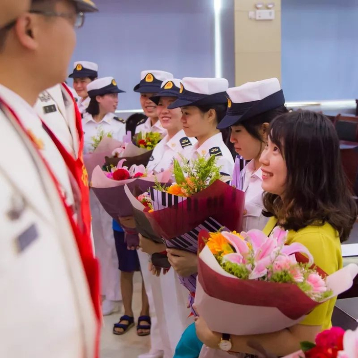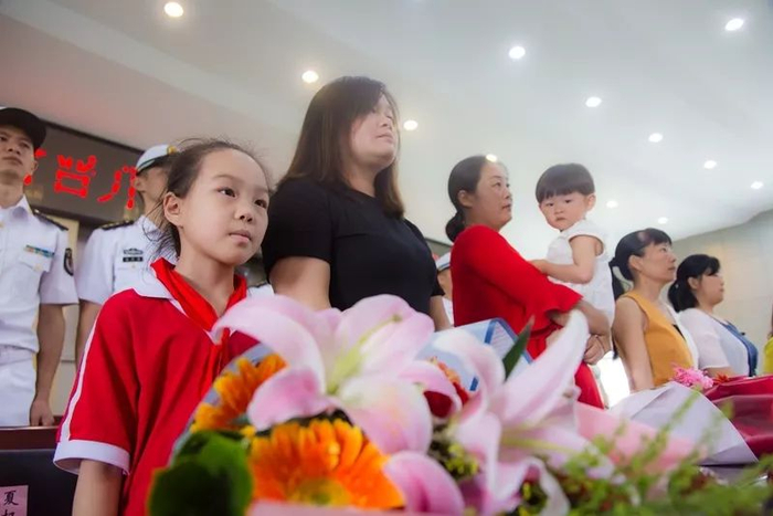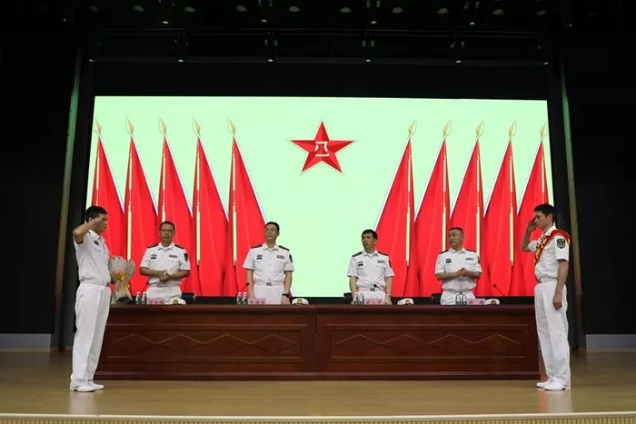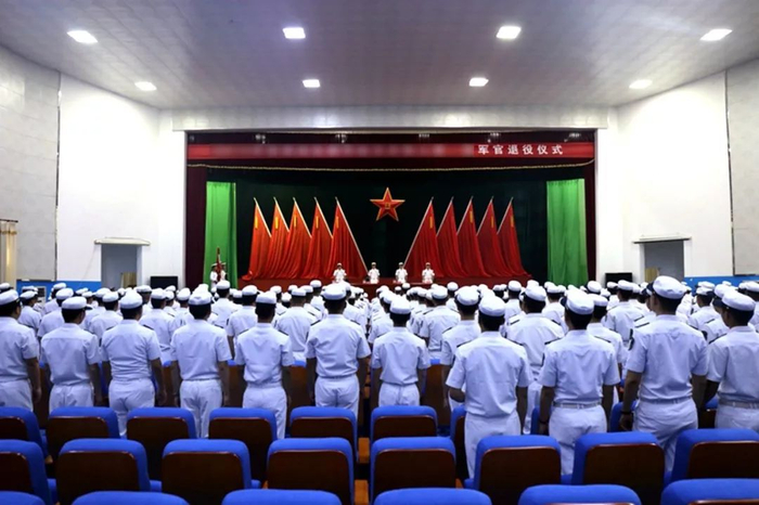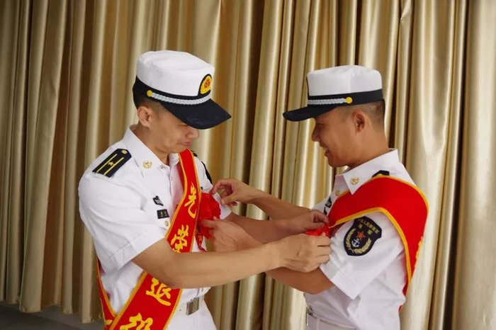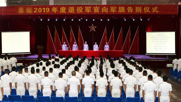 国歌响起,退役军官们佩戴“光荣退役”绶带昂首挺立。白军装配上红绶带,是青春挥洒海疆的色彩。