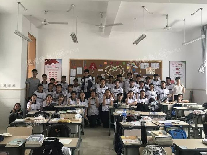 ▲郑荣权(最左)参加普通中学的实习 图自温州晚报