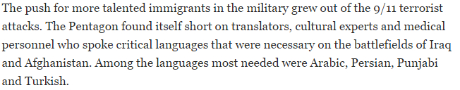 911之后,美国深陷中东战局,急需会说中东语言(阿拉伯语、波斯语、旁遮普语和土耳其语),了解当地文化的人员,还有战地医护人员。