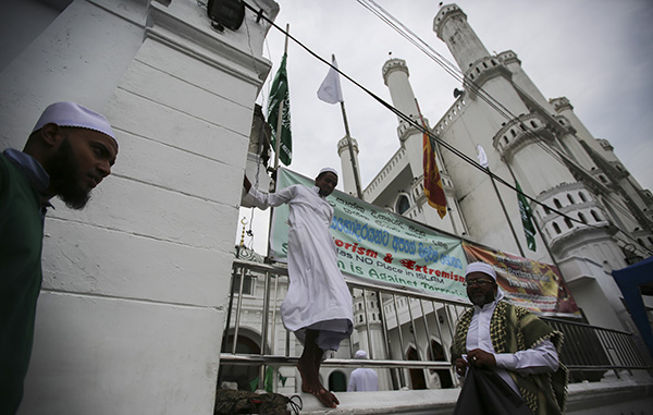 4月26日,Dawatagaha Jumma 清真寺工作人员悬挂反对极端主义的标语。