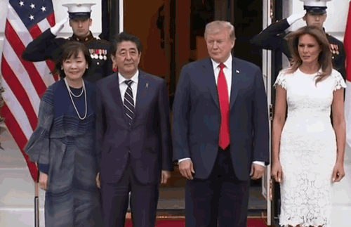 可以看到,特朗普和梅拉尼娅分别站在红毯的居中和一侧边缘位置,而安倍夫妇的落脚点,则根本没有在地毯上。。。。。。