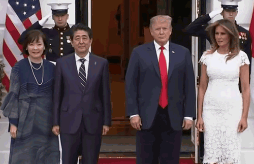 26日当天,特朗普和夫人梅拉尼娅在白宫接见来访的安倍夫妇,并拍下了下面这张合影。