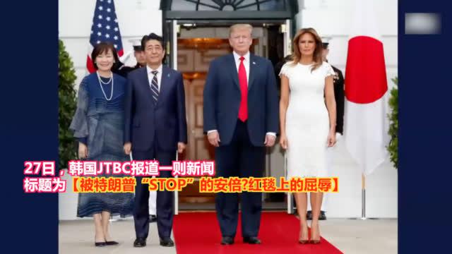 不仅如此,27日,韩国JTBC电视台报道了一则标题为“被特朗普‘STOP’的安倍?红毯上的屈辱”的新闻。