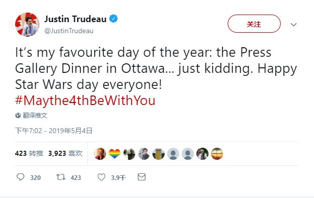 由于5月4日(May the fourth)的英文发音与电影《星球大战》中的著名台词“愿原力与你同在”(May the force be with you)很相近,因此这一天也被称为“星球大战日”,特鲁多在这则推特上也加上了“愿5月4日与你同在”的标签。↓