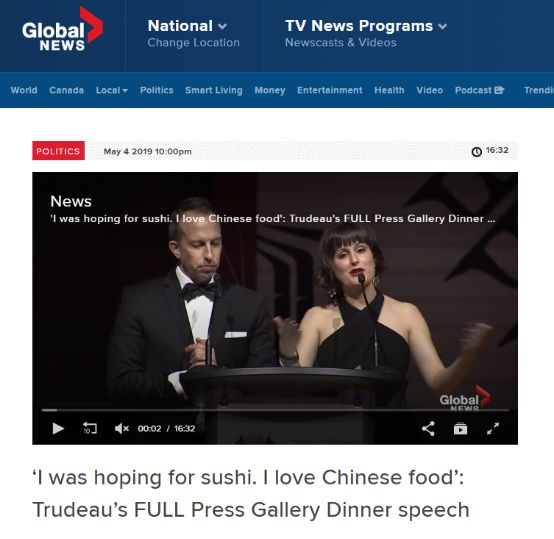 加拿大“全球新闻”网站4日发布了一段视频,该视频为当天傍晚于渥太华举办的媒体晚宴现场录像。特鲁多当天在这个一年一度的活动中发表讲话,并在推特上写道,“这是我一年中最开心的日子”。