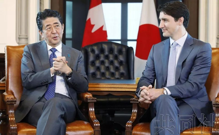 4月28日,安倍晋三(左)与特鲁多举行会谈。