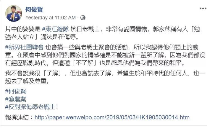 香港立法会委员何俊贤就在他的社交账号上确认了此事,并介绍说老人非常有爱国情怀,而郭家麒抛出的“老人是‘被逼起身’的言论”则是在侮辱她。