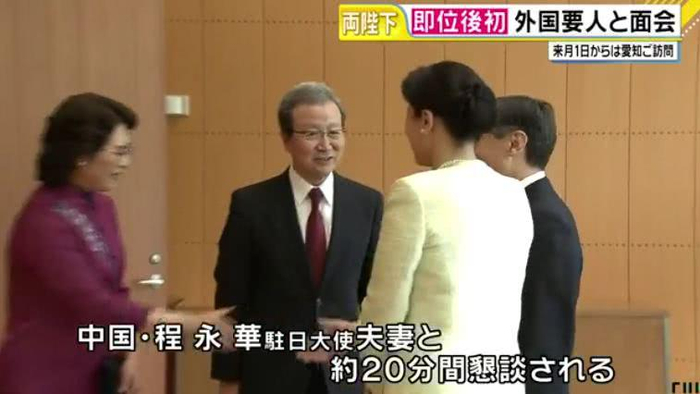 据日本FNN新闻5月9日报道,当天,日本天皇德仁在其住所赤坂御所会见了中国驻日本大使程永华。程永华是德仁即位后会见的第一位外国人及第一位外国使节。