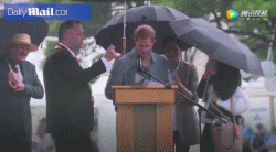 致辞时下起了大雨,哈里立刻暗示旁边想给他撑伞的官员:“你走开,我要我老婆给我撑。”