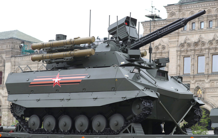图为今年阅兵式上的最大亮点之一,BMPT“终结者-3”坦克火力支援战车,2018年4月刚刚服役,采用T-90A坦克底盘,其用途顾名思义,主要是用于伴随主战坦克作战,也可单独用于巷战突袭。
