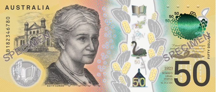 纸币一面印有澳大利亚历史上首位女议员伊迪斯·考恩的肖像,她在1921至1924年间担任议员。