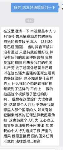 13日,事情有了新的进展。一名自称是视频当事人的人士联系了柬埔寨华人论坛柬单网,宣称视频是其3月15号去柬埔寨旅游时拍摄的抖音段子,当时抖音审核并没有通过,且拍这一视频只是纯属好玩,并没有任何歧视国家、种族的意思”。该人士还表示“也不知道是什么样的人出于什么样的心态,把这样的视频流到平台上”,如果其个人行为造成了很严重的后果,愿意接受国内外任何形式的法律处理。