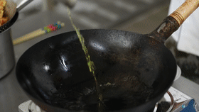 将上浆好的猪里脊在油温7成热时下锅,炸制定型后捞出沥油。(炸第一遍)