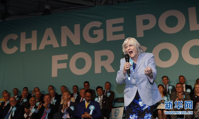 5月21日,在英国伦敦,“脱欧党”的欧洲议会议员候选人安·维德科姆在集会现场演讲。 当日,“脱欧党”在英国伦敦西部举行大型集会,为欧洲议会选举拉票。欧洲议会选举将于本月23日在英国举行。多个民调显示,保守党支持率落后于新成立的“脱欧党”。 新华社记者 韩岩 摄