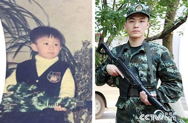 7岁那年的六一儿童节,爸妈带着我来到北京天安门观看升国旗仪式,从此我就迷恋上了军人敬礼的潇洒身姿,但是学校升国旗时规定只能敬少先队礼,所以我就一直梦想着对国旗敬一次庄严的军人举手礼。一次我在看电视时又看到了升国旗的镜头,我不由自主地敬了一个不太标准的军礼,正好被妈妈抓拍到了。现在,我成为了一名武警战士,终于可以堂堂正正的敬一个军礼了! 执勤第二支队某中队战士郭鑫: