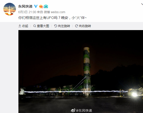 近日,大陆北方一些地区出现了所谓“发光不明飞行物”“天有异象”情况。对此,解放军火箭军官方账号@东风快递于3日夜间发布一张“东风-21”弹道导弹夜间起竖的照片并配以文案“你们相信这世上有UFO吗?晚安,小‘火’伴~ ”。