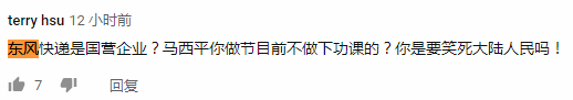 还有人借着马西屏的言论“往下演”,调侃称:(“东风快递”是国企)都被你们知道了,好怕怕。甚至有人认为,说不定他真以为“东风快递”是快递企业。